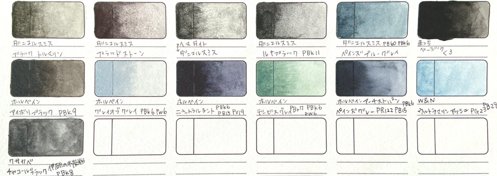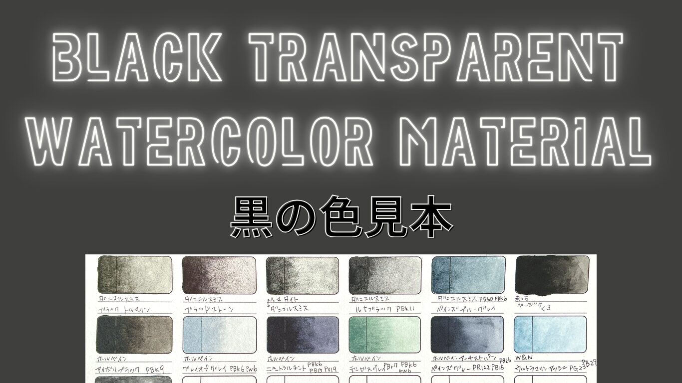 ブラックの透明水彩絵の具は、顔料や見た目の色で分けるのが難しかったのでメーカーで分けていきたいと思います。