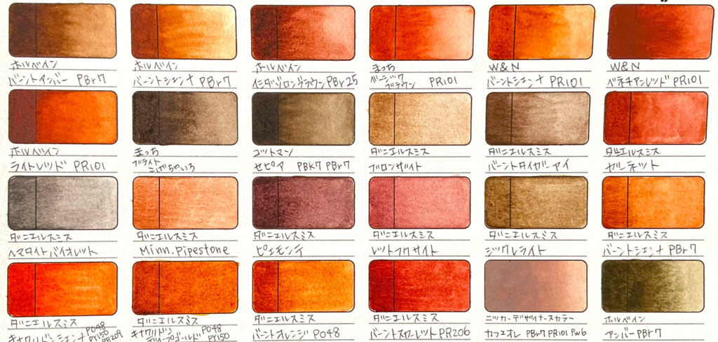 今私が持っている色見本は以上となりますが、他の海外メーカーのブラウン系絵の具もとても気になっているので少しずつ試していけたらいいなと思っています。