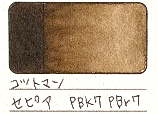 茶色は顔料PBr7、PR101のものや、ダニエルスミスの鉱石の絵の具など様々なものがありました。