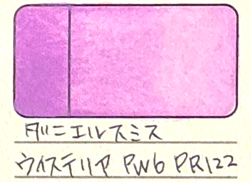 ホルベインのパーマネントバイオレットは、青寄りでも赤寄りでもない印象です。濃く塗ると鮮やかな紫色ですが、多くの水で塗り広げた時には綺麗な薄紫色になるので大変扱いやすく、思った通りの色がでてくれる絵の具だと思います。
